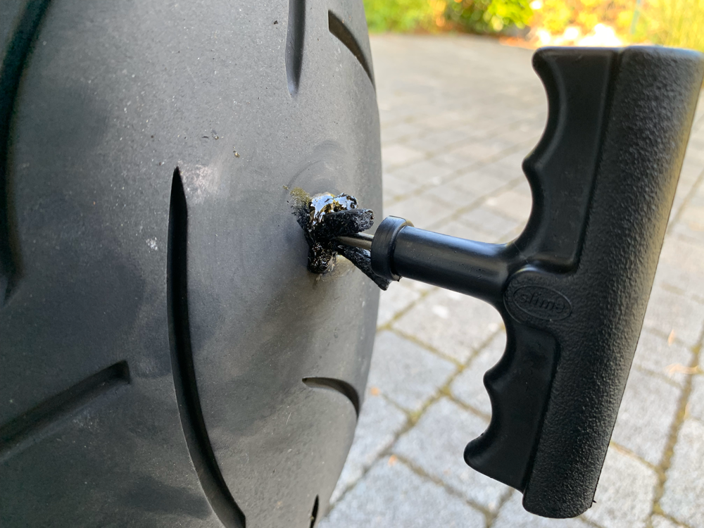 Slime empfiehlt mit dem reparierten Reifen mit reduzierter Geschwindigkeit maximal zur nächsten Werkstatt zu fahren. Das ist sicherlich ein guter Rat. Nach meiner Erfahrung hält der Reifen auch bei normaler Fahrt über längere Distanz durch. Das ist aber ausdrücklich keine Empfehlung.