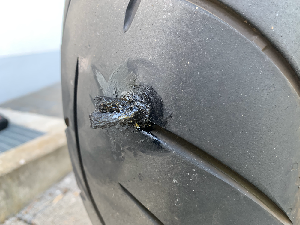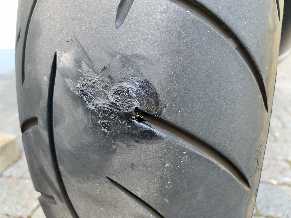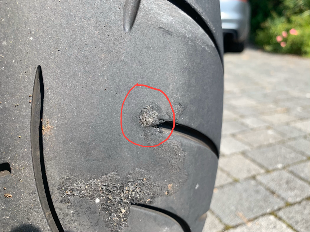 Das letzte Reifenbild zeigt die reparierte Stelle nach ca. 20 KM Fahrt. Die herausstehenden Reste des Pfropfens haben sich abgefahren und teilweise über die umliegende Lauffläche verteilt.