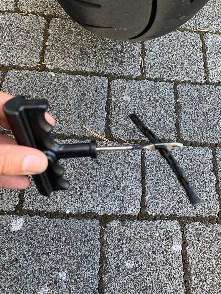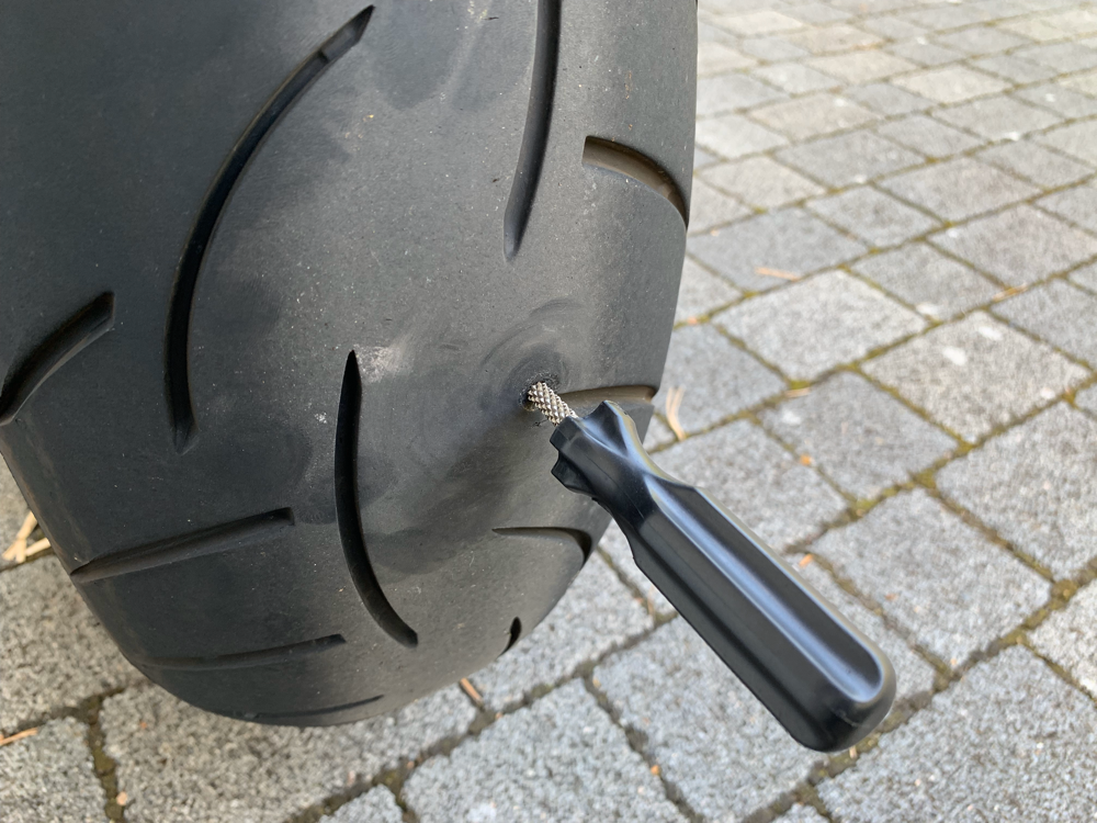 Auch wenn das Set sehr gut ausgestattet ist würde man die Reparatur alleine damit nicht schaffen. Zum Entfernen des Gegenstandes im Reifen, in meinem Fall ein Nagel, braucht man noch eine Zange. Mein Victorinox CyberTool L hat den Job perfekt gemeistert.
